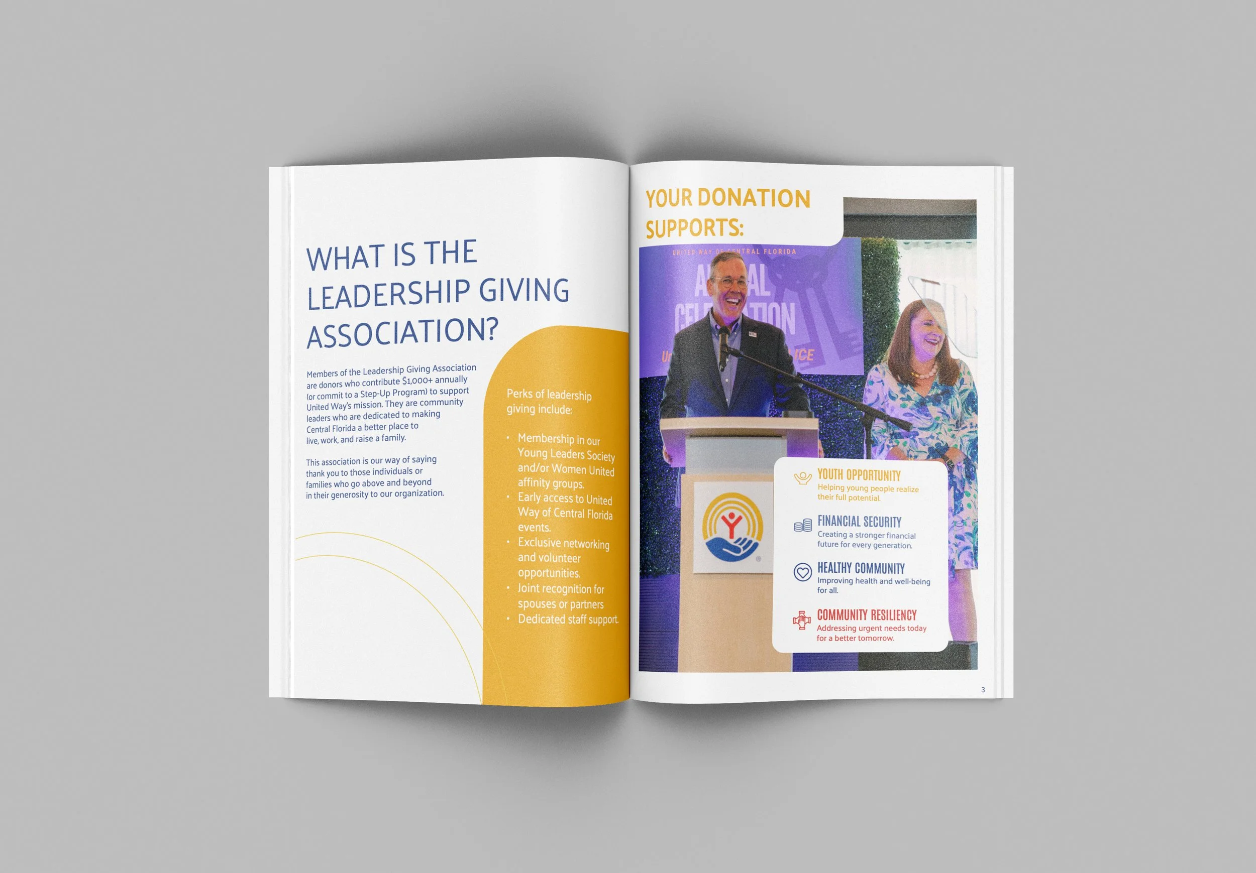 Brochure outlining the benefits of being a Leadership Giver at United Way of Central Florida. This booklet is intended to be distributed to both prospective donors identified as potential Leadership Givers, and existing Leadership Givers who may wish to increase their contributions.